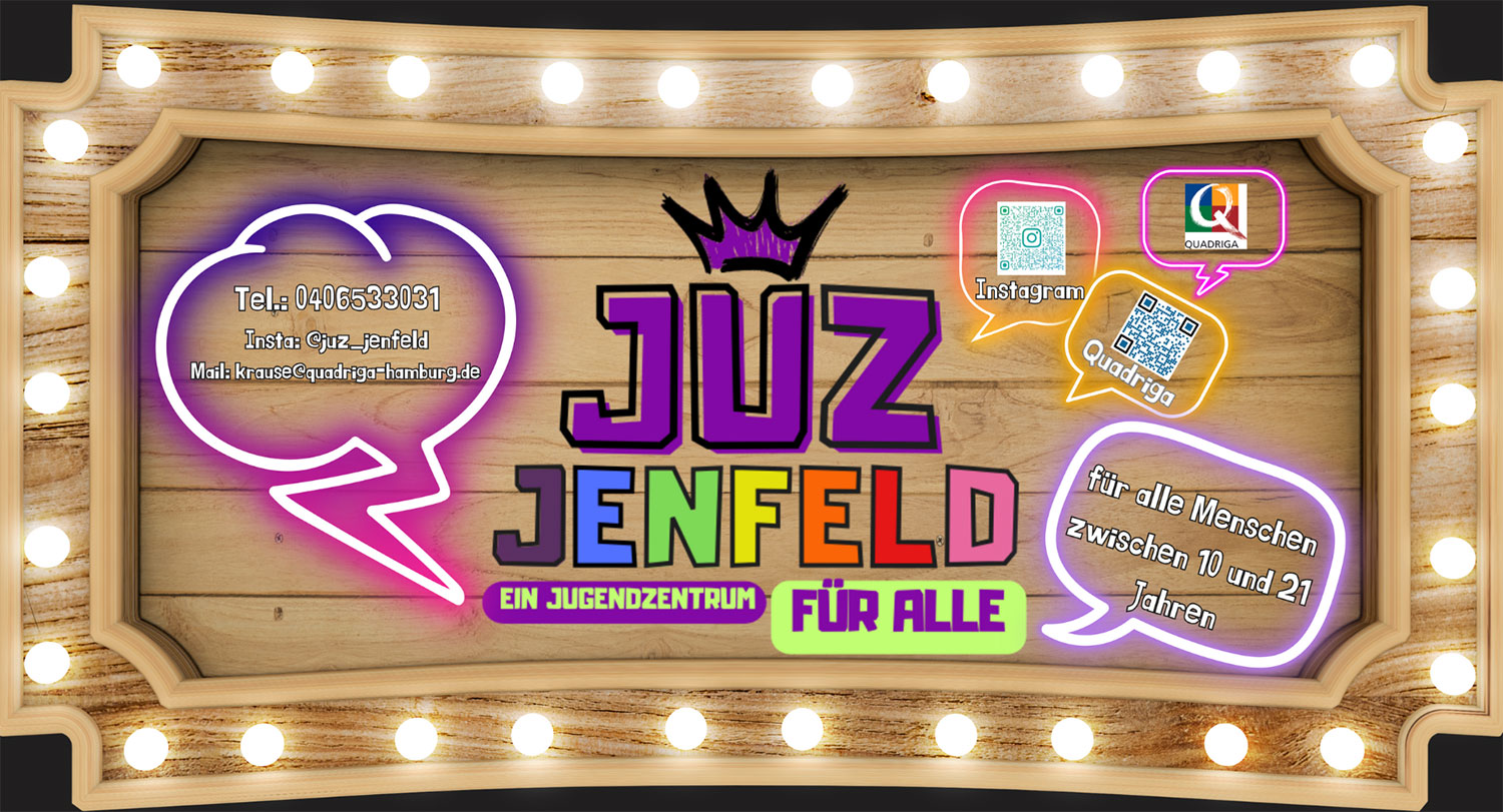 Wenn du zwischen 10 und 21 Jahren alt bist, kannst du bei uns im JUZ Jenfeld Freunde treffen, Songs im hauseigenen Studio aufnehmen, Instrumente ausprobieren, das große Außengelände nutzen, Bogenschießen, Billard, Kicker oder Brettspiele spielen, dich kreativ austoben und vieles mehr.